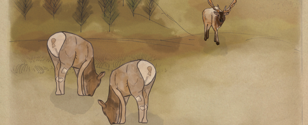 Get to a food source early and set up two feeding cow elk decoys. Position two Miss September feeding elk decoys downwind of where you think the elk will enter the open meadow. Make sure they are visible but also in shooting range. Spray some elk scent in the air, then position yourself in cover 20-40 yards farther downwind of the decoys. Wait for a bull elk to come join the party.