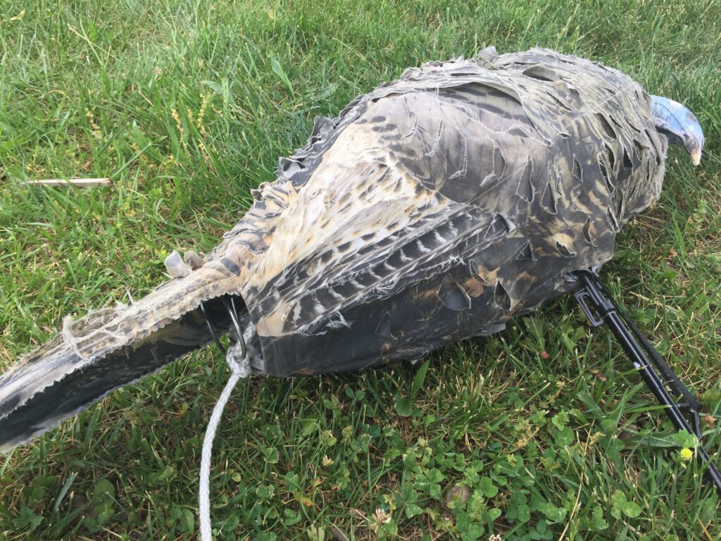 The following setup will help you add more motion and also give you the ability to face a turkey with your decoy. The basic process involves tying off one end of fishing line to your decoy’s beard or tail and running the line back to your spot.