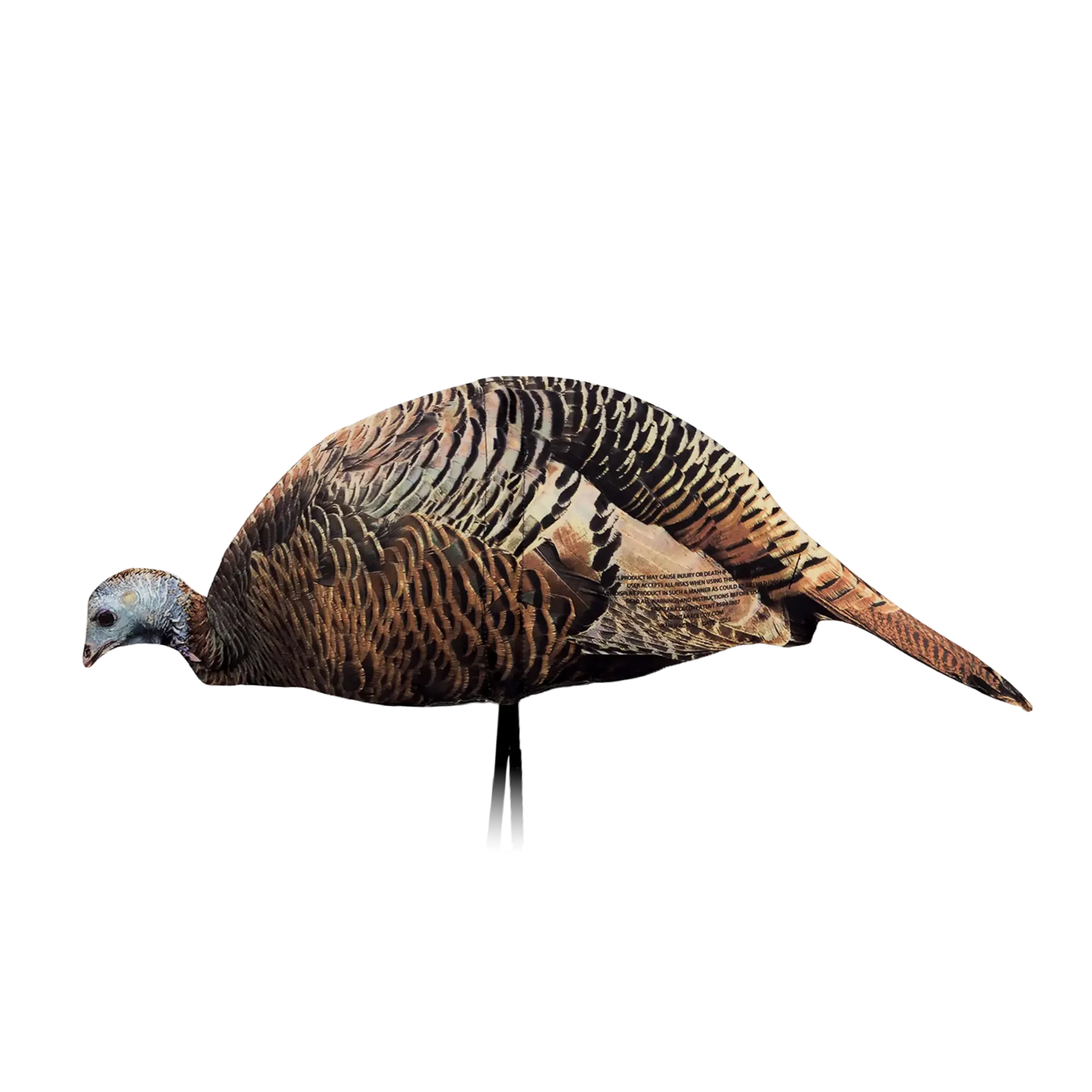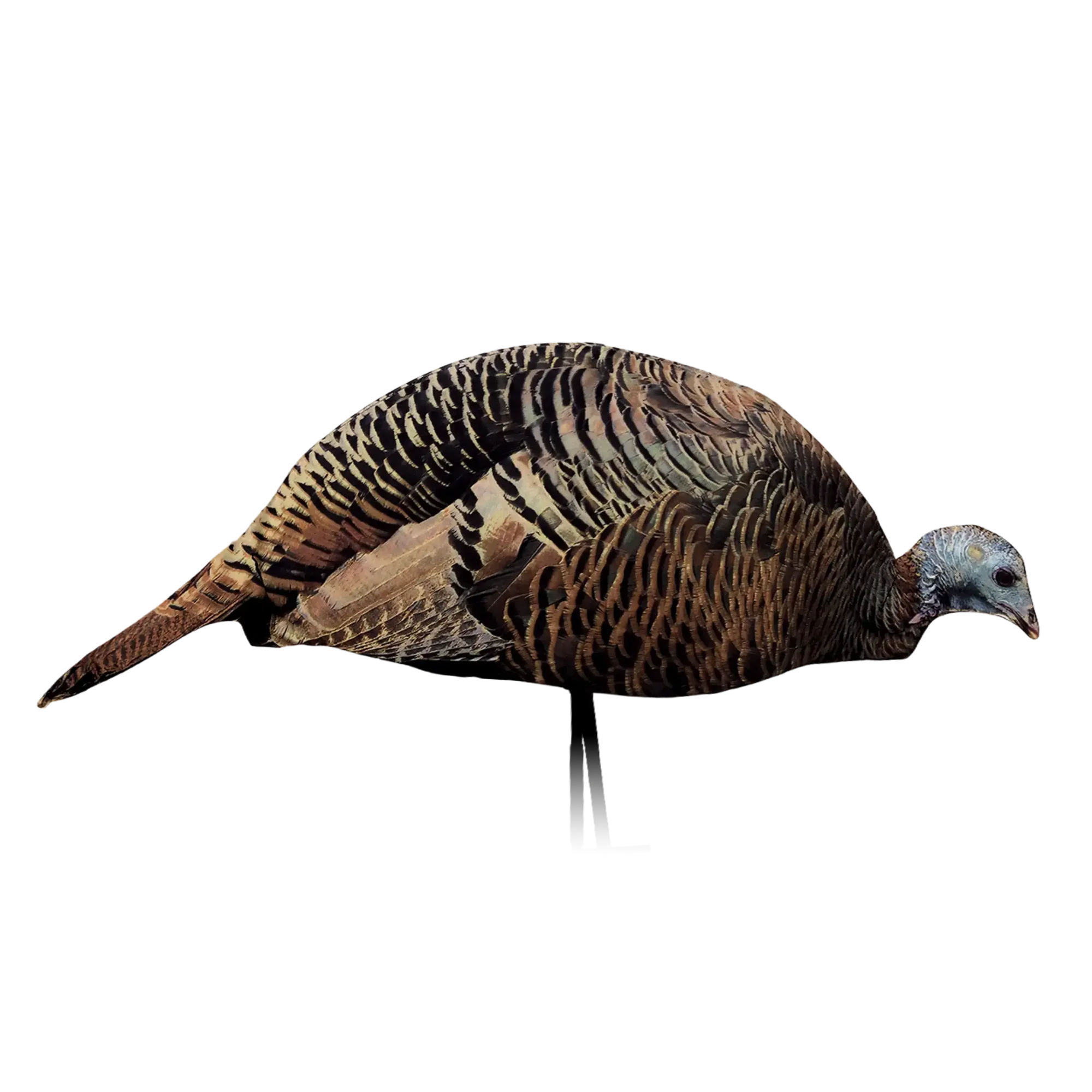 Dinner Belle Hen puts realism to work in your spread. Its relaxed feeding pose signals confidence to incoming birds, while HD photography delivers lifelike detail that helps turn a wary gobbler’s instincts against him. Effective from spring through fall, it works great alone or paired with a tom to pull birds into range.
