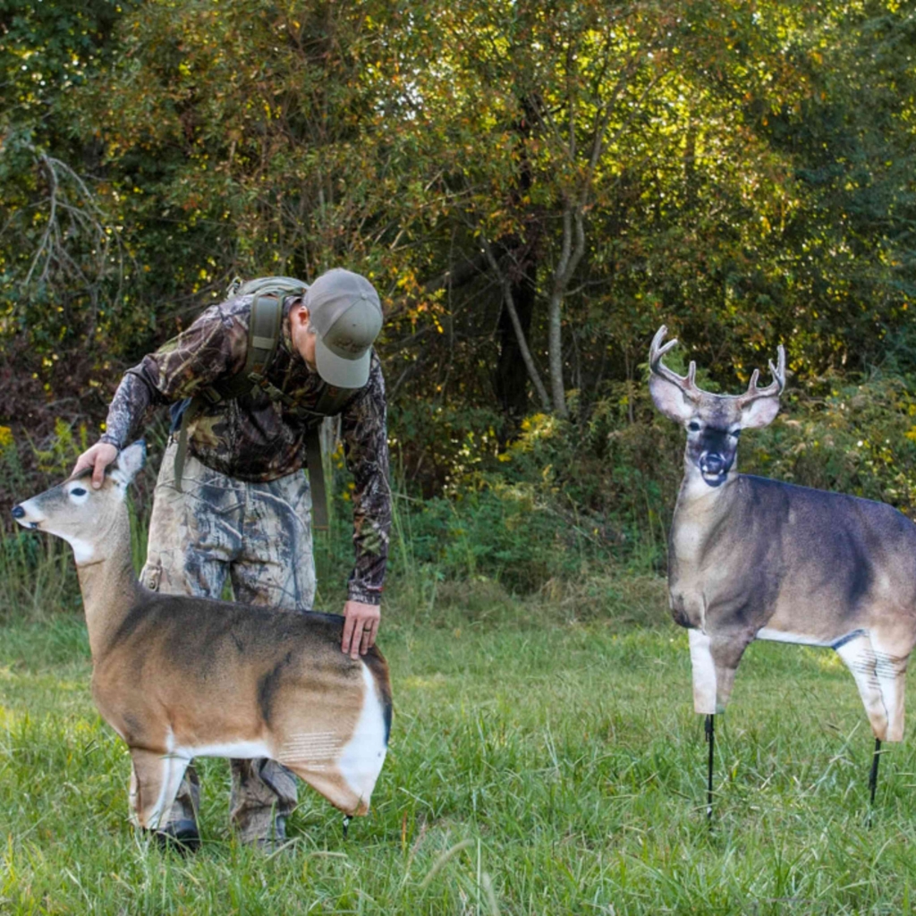 A necessity for any whitetail hunter. The Dream Team – with an all new Whitetail Buck and the proven Dreamy Whitetail Doe decoy – gives hunters a deer decoy system to use throughout the entire season. A better pose and improved print makes the Whitetail buck even more effective. Use the decoys in feeding situations, during all phases of the rut and right up until the last day to make late season food sources seem safer and more appealing. Add a Teaser Tail to one or both of these decoys for extra motion and realism. This deer decoy combination is a must-have for decoy enthusiasts or hunters wanting to add decoying tactics to their archery setup this fall. Leg poles included.